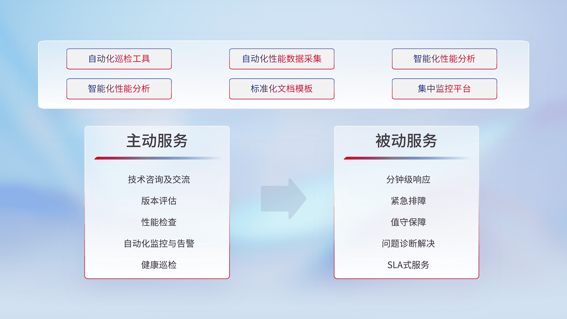 智能化工具和标准化文档,,,,保障服务质量,,,提供主动服务(包含技术咨询、、版本评估、、性能检查、、、自动化监控与告警、、、健康巡检)和被动服务包含(分钟级响应、、紧急排障、、、、值守保障、、、问题诊断解决、、、、SLA服务)。。。。